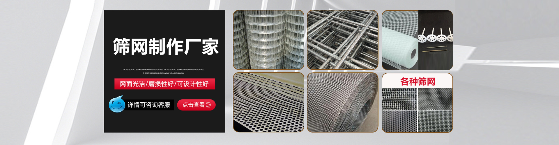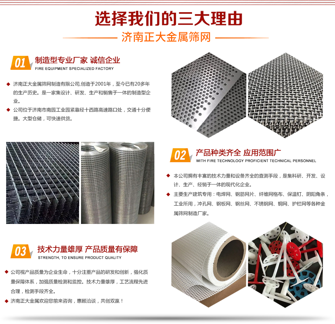 濟(jì)南正大金屬篩網(wǎng)制造有限公司,成立于2001年,至今已有20多年的生產(chǎn)歷史,主要生產(chǎn)建筑用:電焊網(wǎng)、鋼筋網(wǎng)片、纖維網(wǎng)格布、保溫釘、陰陽角條,工業(yè)所用,沖孔網(wǎng)、鋼板網(wǎng)、鋼絲網(wǎng)、不銹鋼網(wǎng)、銅網(wǎng)、護(hù)欄網(wǎng)等各種金屬篩網(wǎng)制造廠家。 本公司擁有豐富的技術(shù)力量和設(shè)備齊全的查測(cè)手段,是集科研、開發(fā)、設(shè)計(jì)、生產(chǎn)、經(jīng)銷于一體的現(xiàn)代化企業(yè)。公司位于濟(jì)南市南園工業(yè)園緊靠經(jīng)十西路高速路口處,交通十分便捷。